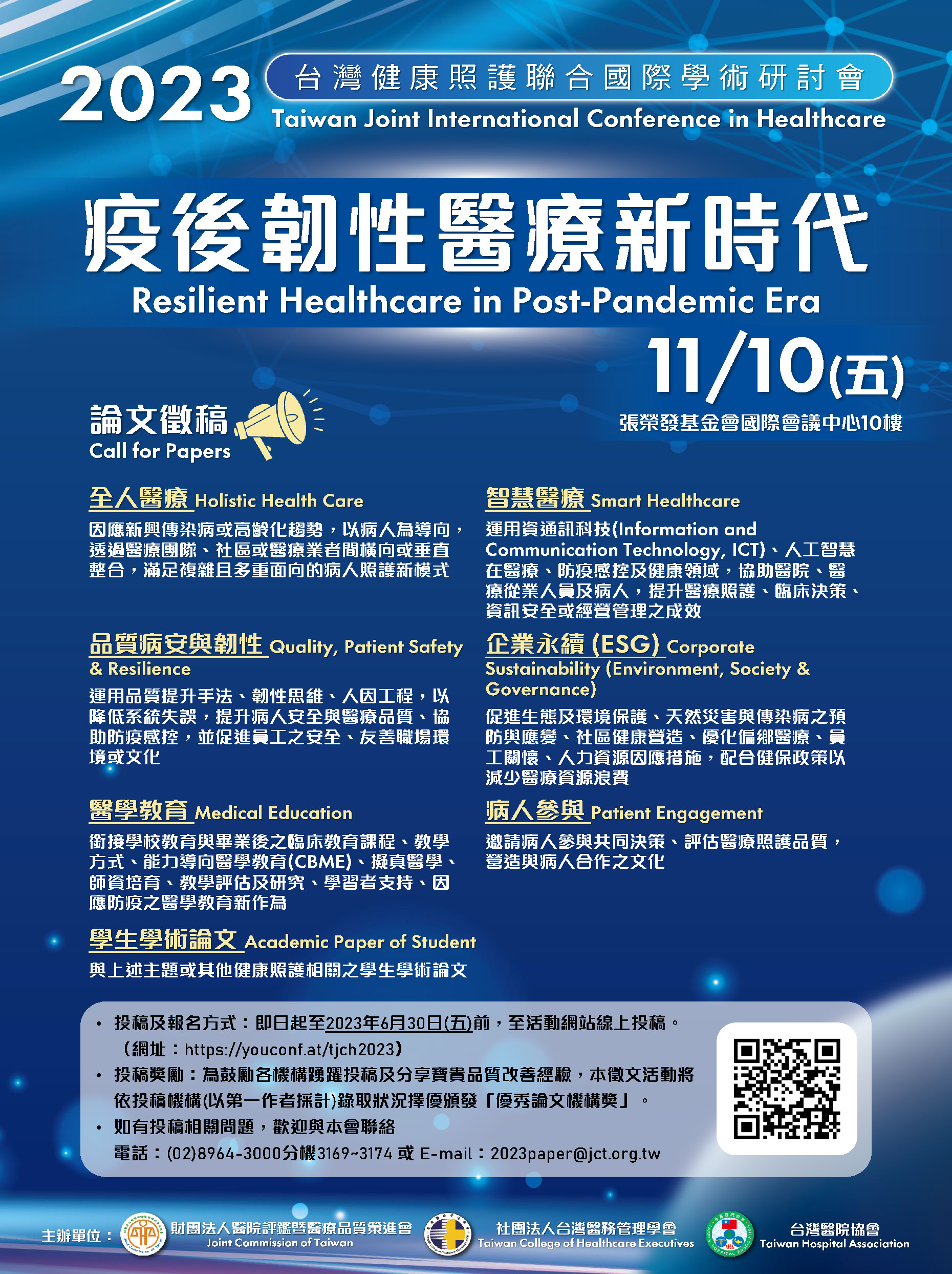 [To Parent Directory] 8/1/2023 7:55 AM 1517370 20230503103711731173.jpg 8/1/2023 7:54 AM 1676045 財團法人醫院評鑑暨醫療品質策進會函(醫品字第1120300177號)檢附「2023年台灣健康照護聯合國際學術研討會」報名訊息,敬請惠予公告周知,並鼓勵貴機構所屬人員踴躍參與,請查照。.pdf