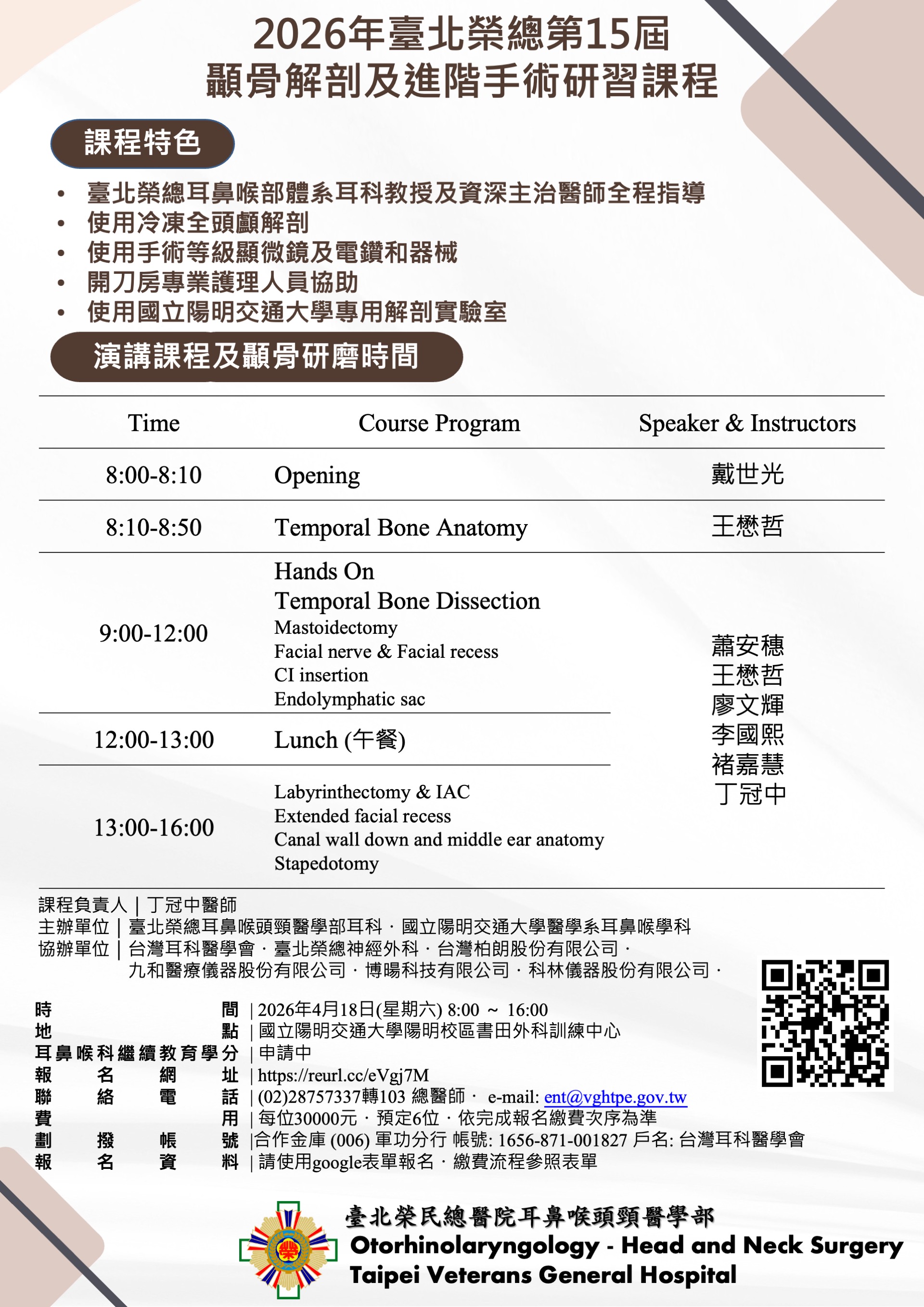 [To Parent Directory] 3/17/2026 5:44 AM 462886 1150412議程表CV摘要.pdf 3/17/2026 5:43 AM 1107676 2026無語良師頭頸局部皮瓣及自由皮瓣暨喉重建模擬手術課程手冊.pdf 2/6/2026 3:12 AM 897341 無學會版本2026年台北榮總第15屆 顳骨解剖及進階手術研習課程.jpg